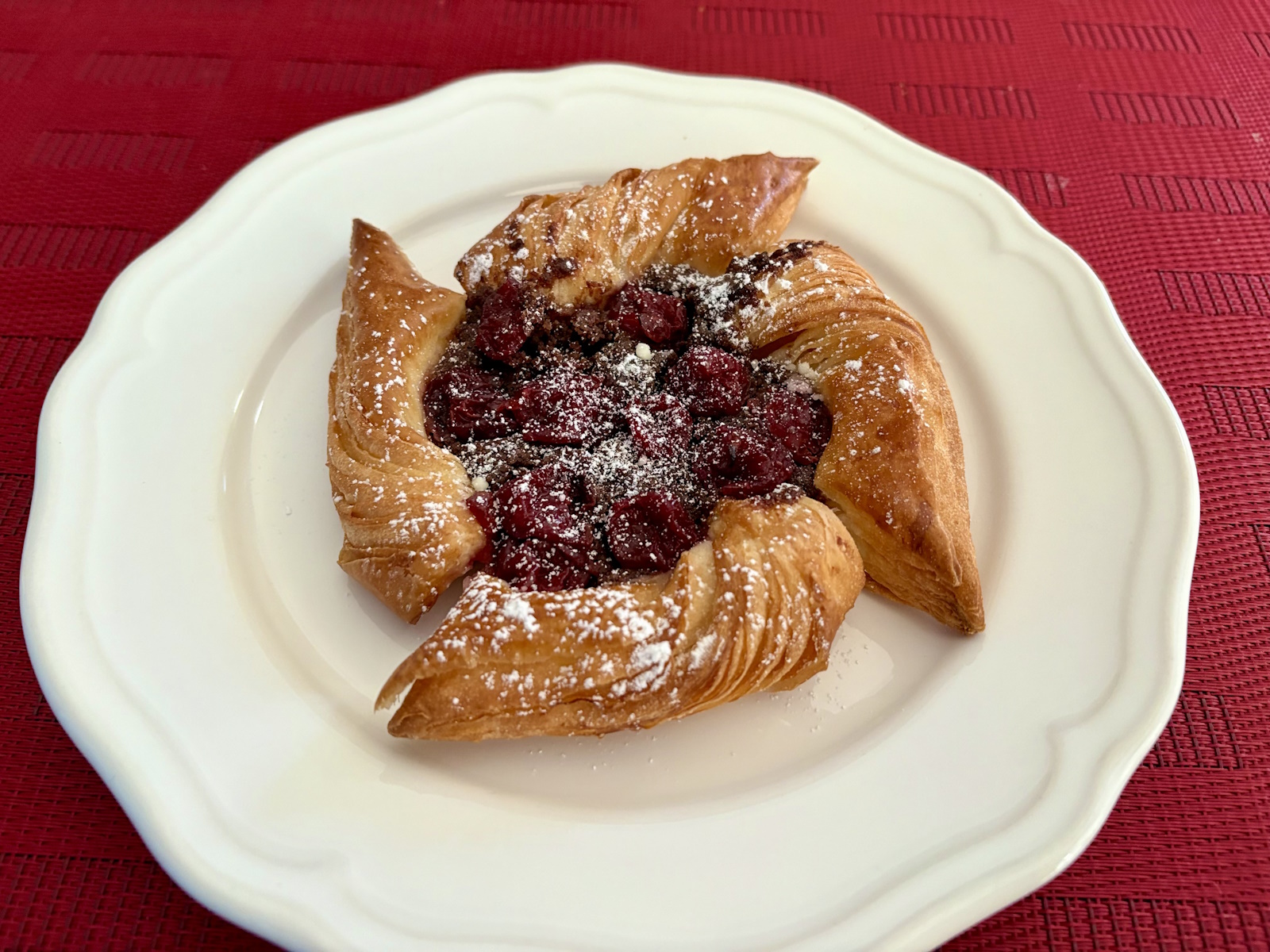 Danish filled with chocolate almond cream and topped with candied cherries.