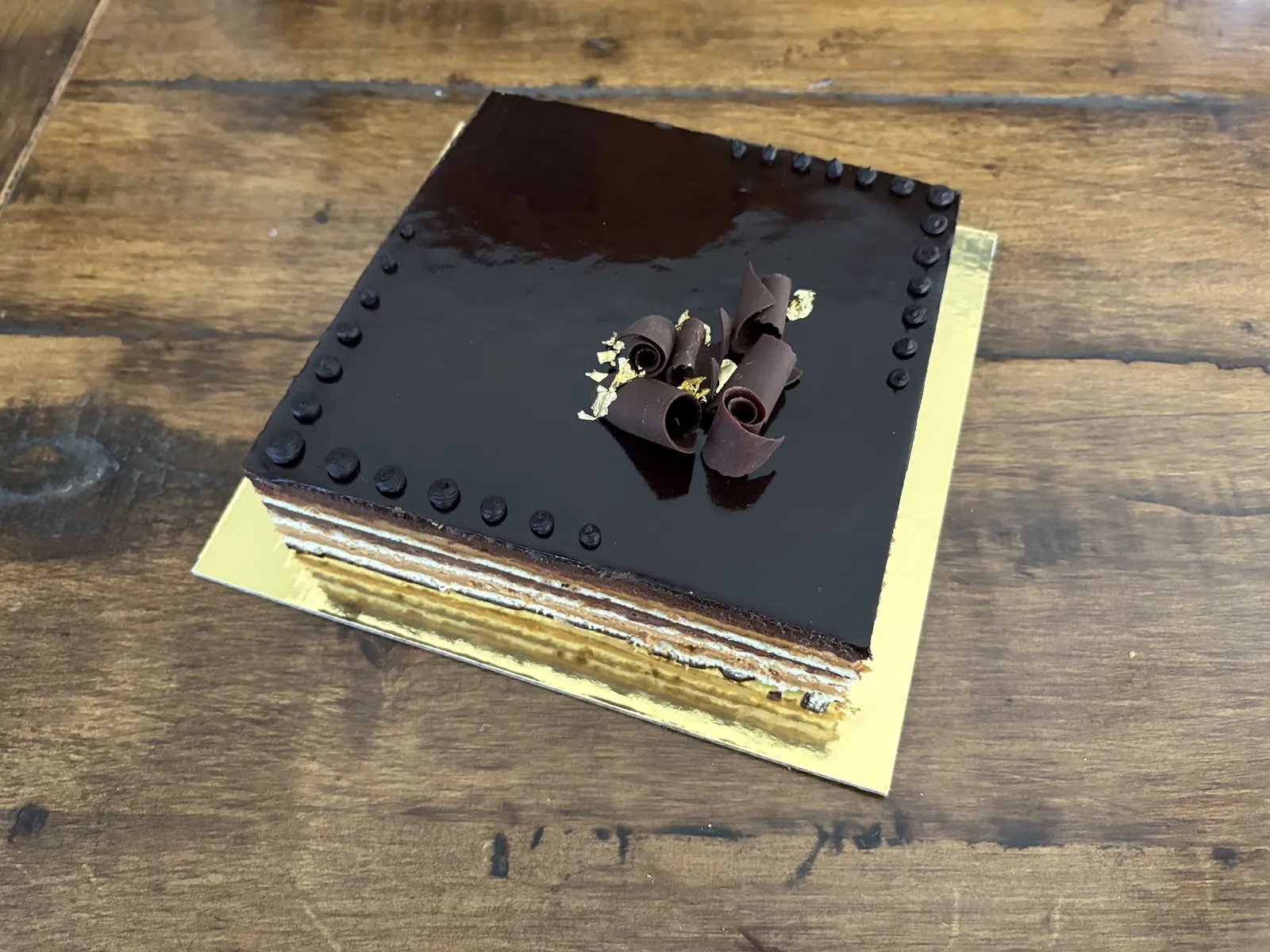 A masterpiece that St. Honore Bakery has been crafting for over 20 years with the utmost respect for authentic French culinary traditions. This exquisite cake is layered with delicate joconde sponges soaked in coffee-rum syrup, featuring espresso buttercream and rich dark chocolate ganache. Finished with shaved chocolate and gold leaves. Two sizes available.